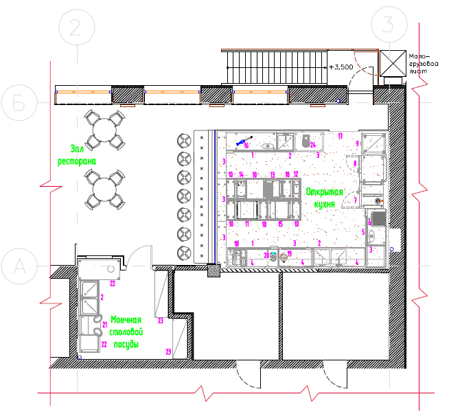На данной расстановке обозначена кухня, которая находится в отдельном помещении, а не непосредственно в зале. Посетители могут понаблюдать за процессом приготовления заказанного ими блюда рядом с кухней – для этого выделена специальная зона, — а могут разместиться за столиками в зале.