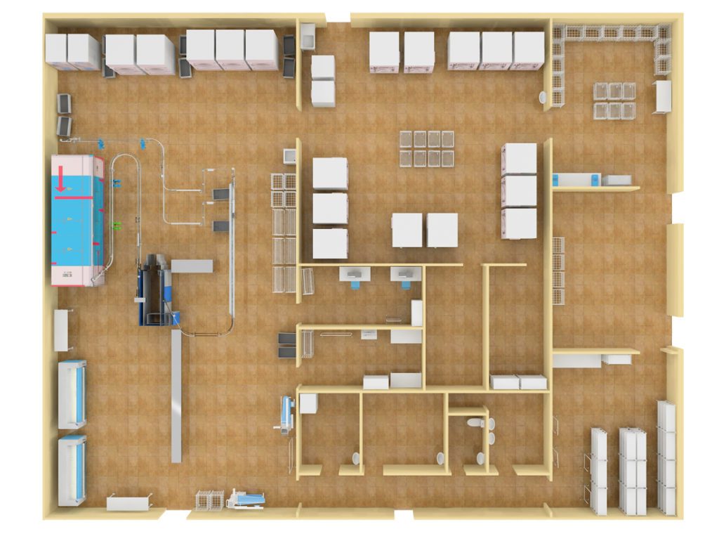 Уход за униформой и спецодеждой современного предприятия требует квалифицированного подхода к технологии стирки с учетом специфики загрязнений. В настоящий момент достаточно сложно найти прачечную-партнера, которая сможет предоставить квалифицированный подход при стирке многих специфических загрязнений и сохранить при этом изделия на максимально продолжительный срок. Наличие же собственной прачечной на предприятии предоставляет Вам полный контроль технологии стирки белья, снижение брака, исключение затрат на логистику и сокращение периода оборачиваемости изделий. Зачастую себестоимость стирки спецодежды в разы дешевле стоимости стирки в коммерческой прачечной, поэтому капиталовложения в прачечную окупятся очень быстро. Организация прачечной требует проведения ряда расчетов с целью определения необходимой мощности оборудования, площади помещения и потребности в энергоносителях. ПРОФЭКВИП предоставляет все виды консультационных услуг по расчету прачечной, подбору оборудования, его поставке, вводу в эксплуатацию и дальнейшему гарантийному и постгарантийному обслуживанию. Предлагаем Вам ознакомиться с проектом прачечной на предприятии, выполненным специалистами нашего Проектного отдела. . Оборудование размещено с учетом оптимальной логистики белья. Помимо стирального и сушильно-гладильного цехов, предусмотрен участок ремонта униформы, приемка и сортировка грязного белья, участок выдачи и склад чистого белья, а также необходимые технические и подсобные помещения. Для реализации данного проекта прачечной на предприятии подобран комплект оборудования ведущих европейских производителей, с которым Вы можете более подробно ознакомиться ниже: СПЕЦИФИКАЦИЯ ОБОРУДОВАНИЯ № Наименование Количество 1 Стиральная машина, W4600H 8 2 Стиральная машина, W4400H 5 3 Стиральная машина, W5300H 2 4 Сушильный барабан, Т41200 5 5 Сушильный барабан, Т4900 3 6 Сушильный барабан, Т5550 2 7 Гладильный каток, IС44825 2 8 Гладильный стол, Genus S 2 9 Тоннельный финишер, Omega Pro 1 10 Складыватель униформы, Butterfly Fox 1 11 Упаковочная машина, HP 500 ТМ 2 12 Упаковочная машина, HP 630 KW 1 13 Маркировочная машина, Y-151 2 14 Тележка для грязного белья, КТ1 14 15 Тележка для чистого белья, AL2 12 16 Стол передвижной, MTR2(F) 3 17 Контейнер для перевозки белья, GC2 23 18 Передвижной стеллаж, R2 8 19 Передвижное вешало, G1 7 20 Стеллаж, BLS1304 15 21 Стол, TG1510P 5 22 Стол с ванной моечной, LG1216DXP 1 23 Ванна моечная, LG716P 1 24 Стеллаж, SM412 4 25 Швейная машина, DDL-8700-7-WB 2 Схема расположения оборудования: Данное решение может быть взято за основу при проектировании прачечной на предприятии. Но, в каждом отдельном случае, организация прачечной требует индивидуального подхода и учета всех особенностей будущего предприятия. Если Вы планируете организовать прачечную на предприятии, специалисты нашей компании готовы помочь Вам в этом на любой стадии реализации проекта. Рассчитать проект +7 (499) 302-37-62 или позвоните нам по телефону, мы всегда на связи Для заполнения данной формы включите JavaScript в браузере.Для заполнения данной формы включите JavaScript в браузере.Имя *Эл. почтаТелефон *Комментарий Телефон Имя Эл. *- обязательные поля Нажимая на кнопку вы соглашаетесь с политикой обработки персональных данных Рассчитать Рассчитать Навигация по записямПредыдущаяПредыдущая запись:Промышленная прачечнаяСледующаяСледующая запись:Фаст-фудПохожие ст